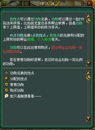 功勋可以在帮会城市——书院——帮会师爷(顾文渊)处兑换抗性点,功勋兑换抗性点和可分配抗性点的数量和玩家本身的修为等级,玩家所在的帮会规模相关。