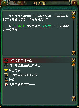 到帮会城市——帮派药房——NPC刘天若处使用经验学习技能。
