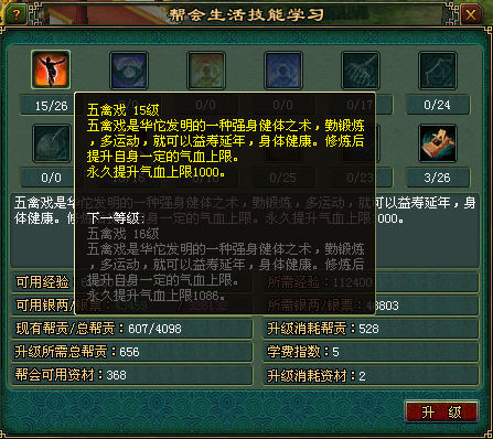 每次我们去药房买药或者提升生活技能等级的时候,大家不知道是否有发现第一排有一些非生活技能类的技能出现?它们,可以提升我们的我们气血上限、法力上限、体力上限、活力上限。不用多说帮派修炼,其拥有非常大的价 值,是PK,生活,战斗不可缺少的技能。