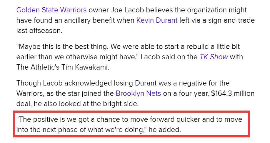 日前,勇士老板拉科布在参加一档名为TK秀的节目中,谈到了他对杜兰特离队的看法。尽管这对勇士是一个重大的损失,但拉科布表示,杜兰特选择离开的方式,已经给球队创造了最好的条件。