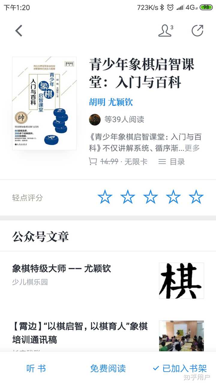 之所以推荐这本,是因为这本是写给青少年的象棋怎么玩,内容比较有趣,不太枯燥。(软件微信读书)