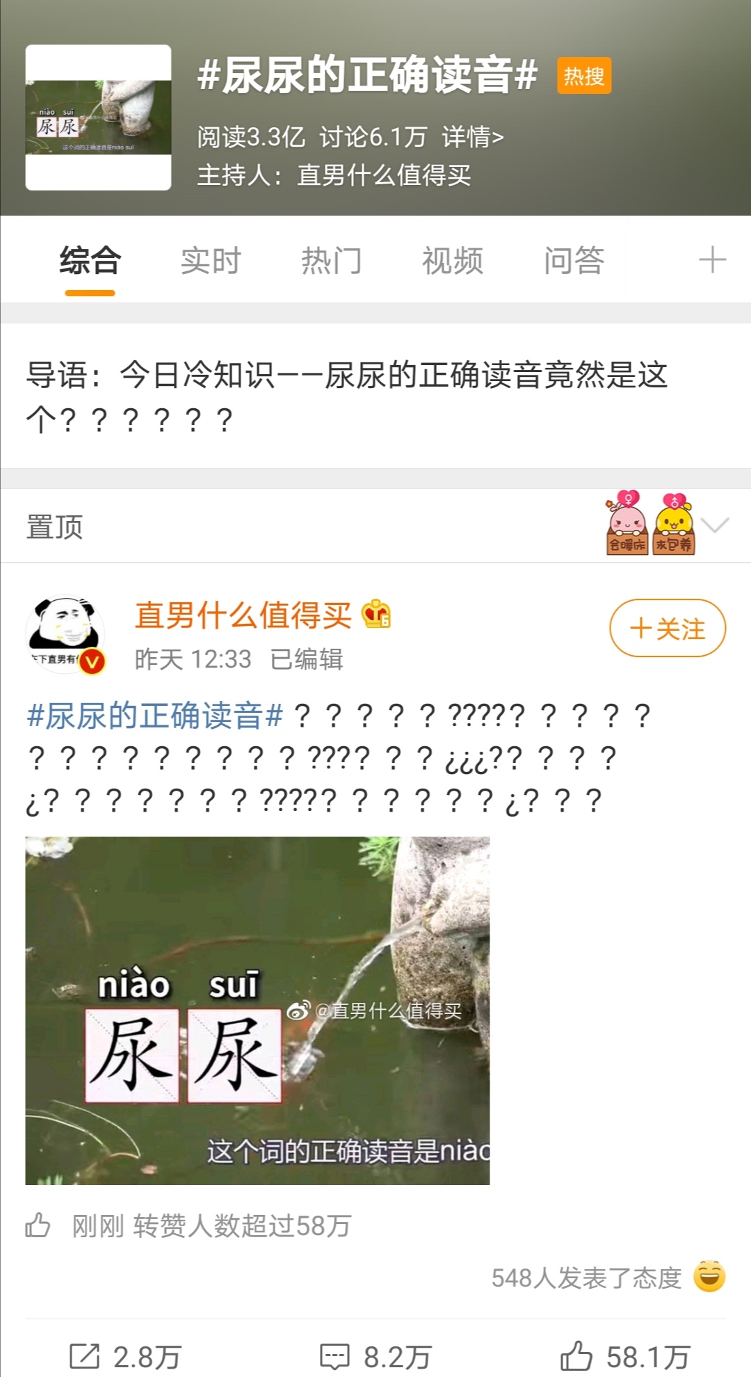 3月9日,一位微博网友贴出尿尿的正确读音应该是“niào suī”,让不少网友难以置信,一时引发热议,让“尿尿的正确读音”冲上热搜榜,话题阅读量超过3亿。