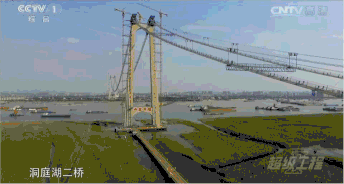 庭湖二桥,跨度1480米桥梁建设,由两座重量超过63万吨的锚碇,两座超过200米高的主塔,两条2600米长的主索缆和超过4.3万吨重量的钢桁梁桥面组成,