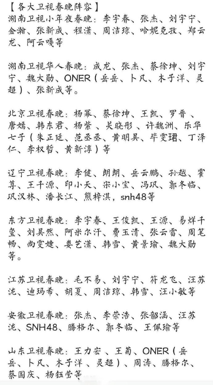 【导语】:2019各大卫视春晚阵容曝光!湖南卫视小年夜春晚、湖南卫视华人春晚、北京卫视春晚、辽宁卫视春晚、东方卫视春晚、江苏卫视春晚、安徽卫视春晚、山东卫视春晚、江西卫视春晚等八大卫视春晚名单都在这啦!