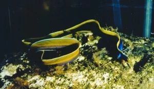 饲养五彩鳗必须为它们提供躲藏的洞穴,一段直径2厘米的塑料管是很好的东西,五彩鳗非常喜欢在里面钻来钻去,没有隐蔽处可能会造成它紧迫而绝食。很多种鱼会伤害到五彩鳗,特别是蝴蝶鱼、神仙鱼和倒吊类,它们经常啄咬五彩鳗裸露在外的皮肤,混养时要尽量避开。在饵料营养不充分的时候,雄性绚丽的蓝色会逐渐褪去,每周要多喂一些蛤肉、虾肉才能维持这种颜色。幼年的五彩鳗很少能在人工环境下变出成体那样的美丽颜色,如果你喜欢它们美丽的蓝色和金黄色,就直接购买成鱼吧。
