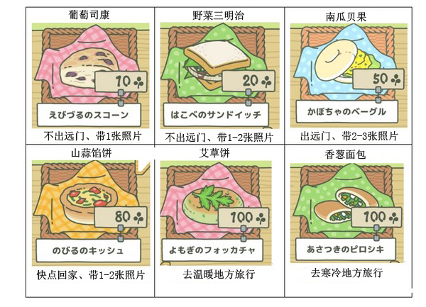 《旅行青蛙》每种道具皆有不同的功效,玩家需要提前打包旅行用的食物,让出门旅行的青蛙们不会饿肚子,像是希望小蛙赶快出远门的玩家就可以准备野菜三明治等,每种食物皆是消耗品,一旦吃完就要再花三叶草货币购买。