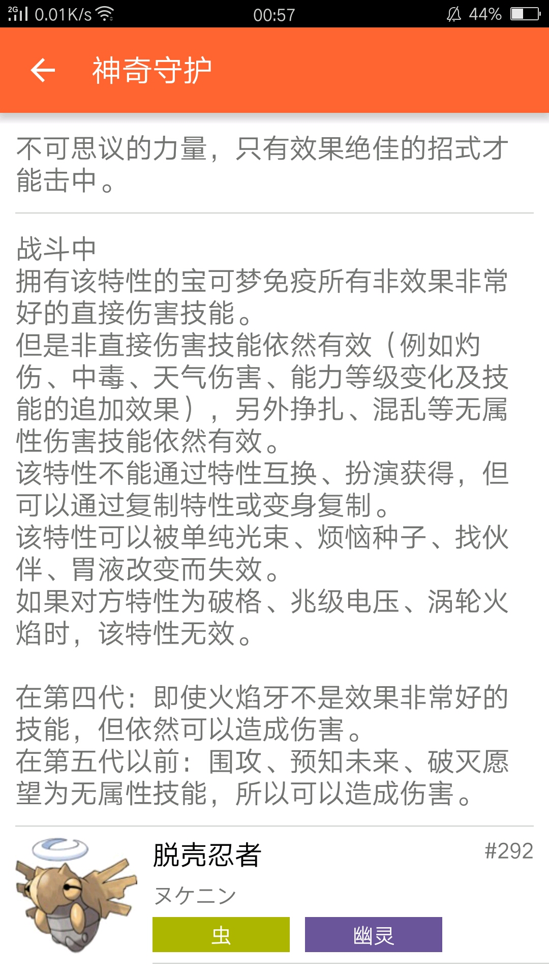 除了飞行,恶,岩石,火,幽灵。这五个属性的招式以外,其他属性的招式对脱壳都是无效果的,(挣扎除外)当然破格另外说。如果脱壳是恶幽灵属性,那么mmo环境下没有攻击技能可以打死它,不过沙暴,雪天,隐形岩,撒菱,还有剧毒,烧伤的负面效果也是可以弄死脱壳的,另外凹凹头盔,附着针和粗糙皮肤,铁刺两个特性也是可以弄死鬼婵的(ps火焰之躯特性也可以不过要被触发),所以这个就是鬼婵算什么PVP不热门,但是确实现在天王队的核心输出手的原因,只要注意几个点基本鬼婵在每个天王都有出场的机会,这样大大提高了搬天王的效率(具体我就不说了)。