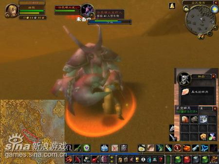 一个小窍门:在沙漠中经常有一些原始巨大动物的骸骨,这里聚集着很多火鹏,等级为43-45。(图中的位置就是一个)有实力挑战的玩家可以在这里杀,不必四处奔跑。