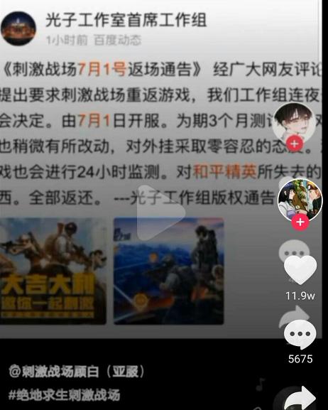 有网友在微博发布动态称:刺激战场将会在今年7月1日返场回归,光子给玩家们一个大惊喜。还扬言如果自己所言不实,以注销自己的微博账号