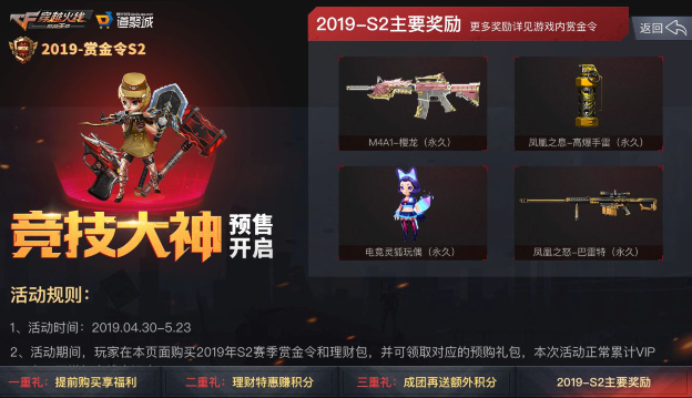 1、活动期间,玩家在本页面购买2019年S2赛季赏金令和理财包,并可领取对应的预购礼包,本次活动正常累计VIP点,不增加火线幸运点;