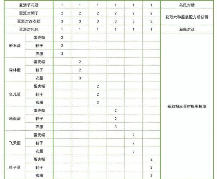在本次活动中,玩家可以挖到六种不同的复活节彩蛋,以之为素材,配合特殊的复活节 DIY 图纸,即可获得复活节特色家具、衣服及道具。