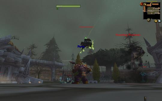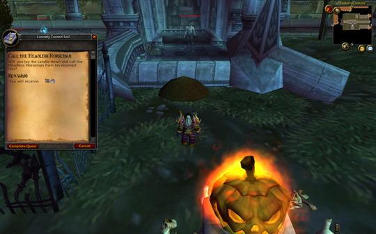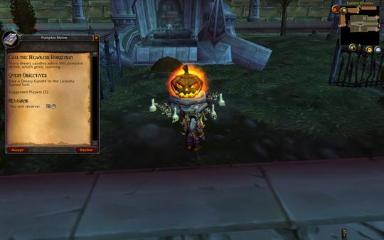 万圣节的boss无头骑士将出现在血色修道院的墓园,一个70级的5人小队可以干掉他。如下图,找到南瓜灯,并召唤出死亡骑士,然后看看有没有掉落飞行扫帚吧!