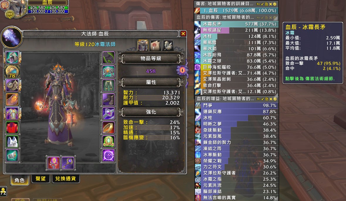 原本我一直都是纯火法打5面具的,因为觉得冰法在打单体方面可能会有麻烦,随着披风等级渐渐提高,我也试着用冰法挑战看看,发现其实输出上并没有太大问题,而是生存能力较火奥差蛮多,但是可以稳扎稳打慢慢推进,给没有火奥装备可以切换或只会玩冰法的玩家参考