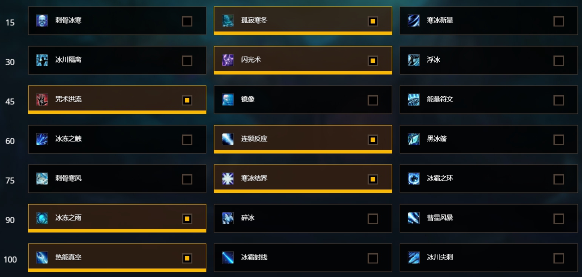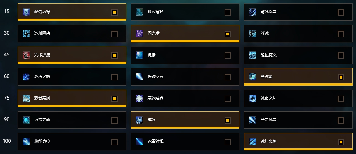 全部都是可以稳定吃到冰冻增益的技能,尤其是用了4个大特质强化的冰枪术,所以优先保证爆击率够高,让冰枪术至少有80%以上的爆击,甚至靠一些触发buff达到90甚至100%