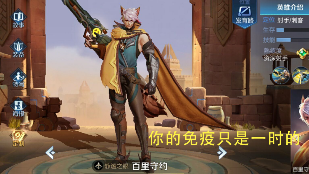 这个英雄上榜的原因主要是对线时候的压制力,一级的时候就可以直接压制虞姬,等级越高伤害也就越高,虞姬的二技能对于百里守约的二技能来说,也就只能挡住一次伤害,第二次再来的时候,就只能凭借走位去躲开百里守约的狙击,躲不开的话两枪绝对残血,不回家的话一发普攻直接带走。