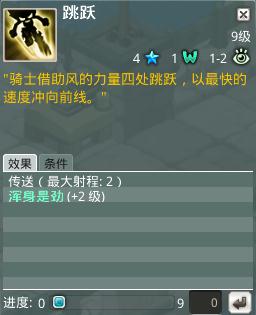 1、跳跃:传送(最远距离:2)0级技能消耗4AP1WP,满级技能消耗2AP1WP,并且使骑士获得浑身是劲效果。