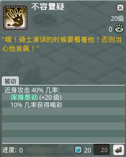 4、炫耀:当队友打出暴击(也就是头上出叹号的攻击),和当队友杀死一个怪的时候骑士天赋, 你都会获得摩拳擦掌的效果