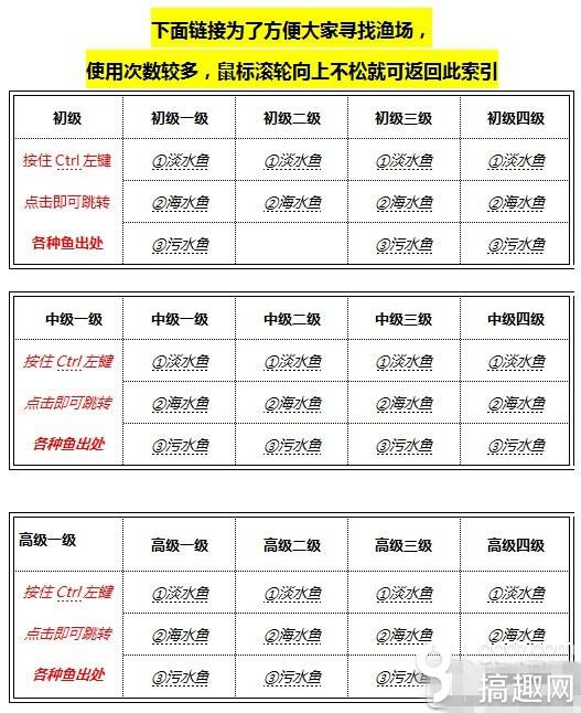 由于本攻略内容超多,word满满20页,而且我用了超链接把所有等级的渔场都做了索引,大家点击word中的各种渔场,即可跳转我给大家截图标注的渔场所在地图。