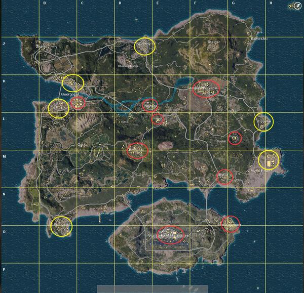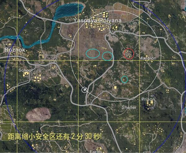 下图中进圈不选红色位置,因为红圈里2个房子太近了,跑毒容易形成互相卡。左边2个蓝色圈是麦田可以伏地且靠中心,可以考虑;右下角的蓝色圈,如果没人在,我们可以去,有人在,就放弃,因为我们已经在这呆了好久了,知道个大概情况。