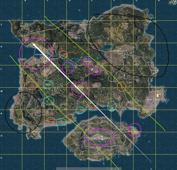 白色箭头代表航线,两边绿色的线表示我们正常跳伞飞行的大概距离,枚红色的圈表示人多的地方,我们不去;蓝色的圈是我们可以考虑降落的位置,是些小乡镇,橙色的位置是可以考虑落地找车,立马开车往黑色圈方向跑的位置,因为橙色靠近马路且靠近绿线,保证我们第一个到达黑圈位置,安全搜物品。