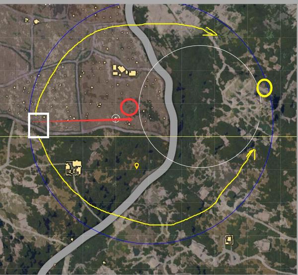 选择蓝白半径最小的距离进圈(下图黄色圈位置)或者特别偏僻人少的位置进圈(记住航线和枪声的位置)这样可以保证进圈时身后没人