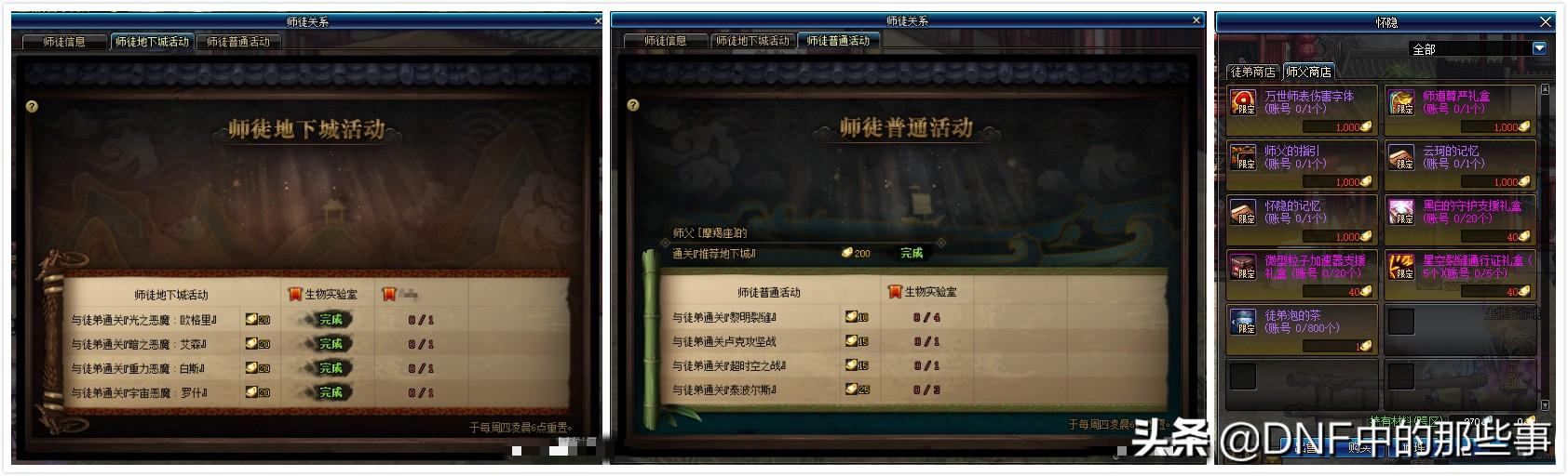 成为师傅的玩家可以在师徒关系中查看师徒地下城跟师徒普通活动的完成情况,只要任务完成了,那么则会获得奖励。这两种活动都可以跟三个徒弟玩家完成,也就是可以获得三次奖励,那么算下来的话,一周的师徒任务全部完成,那么师傅将会获得635个师傅通宝,而师傅通宝则可以在“怀隐”处兑换奖励。