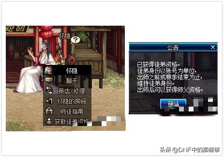 大家进入到五陵后dnf师徒,找到“怀隐”这个NPC,与其对话就可以获得师傅或者徒弟的资格,第一次对话估计就是系统判定,而判定的标准应该就是高级副本的通关次数,也就是现在的漩涡,次数高的自动成为师傅,次数低的则为徒弟。那么成为徒弟的玩家在出师后会自动转为师傅,这样就可以去收徒弟了,这里记住,师傅或者徒弟的资格为账号绑定的。