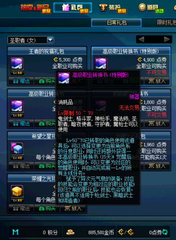 首先说一下低级转职书,50级之前可以使用,但是我们都知道在选择转职后,是有一次免费转职的,再加上选择的升级速度奇快无比,50级之前花费的时间是很少的dnf职业转换书,所以这个道具就很无用,买的人自然不多。而高级转职书,等级限制为70级,这也就导致了只有少部分的玩家会购买,大多也是在把小号练到50级之上时,不想玩这个职业又舍不得节日套的玩家。