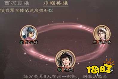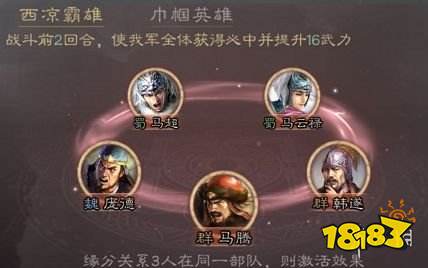 西凉霸雄:这个缘分提供的全体前两回合必中十分适合菜刀队。建议要组的话,用马超+马云禄+马腾反三国志攻略,有会心有必中,再视情况加上虎踞鹰扬,可以说十分暴力。