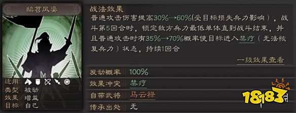 由于马云禄具备5回合后的锁定能力,同时还受敌方兵力减少的加成,所以建议搭配有强续航能力的骑兵武将或战法,如刘备、祝融、象兵、八门金锁阵、暂避其锋,等等。