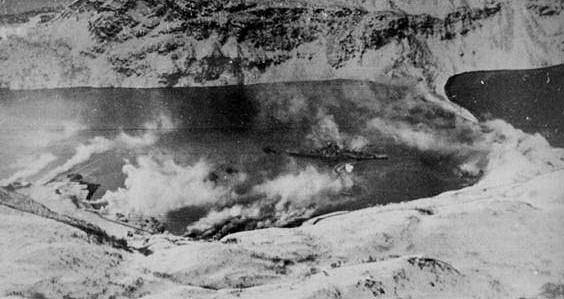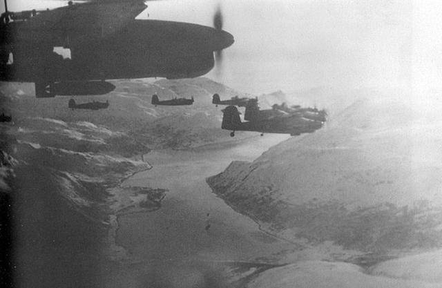福克纳少校率领的第一波21架“梭鱼”直扑 “提尔皮茨”号战列舰所在的阿尔塔峡湾。艺高胆大的海航飞行员竟然全程以10-20米高度贴着海面飞行,浪花甚至溅到风挡玻璃上。接近海岸时机群开始缓缓爬升到3000米高度,只有从这个高度俯冲下去,730公斤穿甲炸弹才能获得足以击穿“提尔皮茨”水平装甲的速度。
