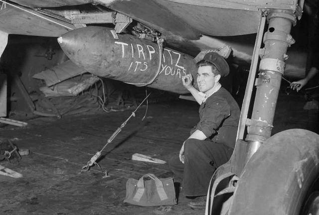 4时20分左右,轻一些的战斗机们——全是美国货——“野猫”、“海盗”、“地狱猫”率先相继起飞,在空中盘旋编队和等待。2艘舰队航母上,第8飞行大队的指挥官贝克·福克纳海军少校把节流阀推到底,放下杨曼襟翼,略显得有些古怪的飞机开始加速,所有人都有些担心地看着,它离开甲板后略微一沉然后稳稳地开始爬升,大家才松了一口气——福克纳少校的座机起飞如此困难,是因为它挂载了一枚巨大的730公斤炸弹,炸弹上还有地勤人员用粉笔留下的字句:“提尔皮茨这是给你的”。