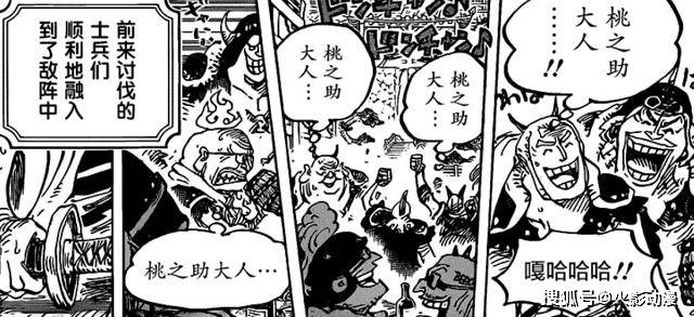 乍一看还以为是凯多的杂兵。与周围的敌人打成一片,嘴里同样喊出讨伐桃之助的话语,那演技炸裂,都可以颁奖了。