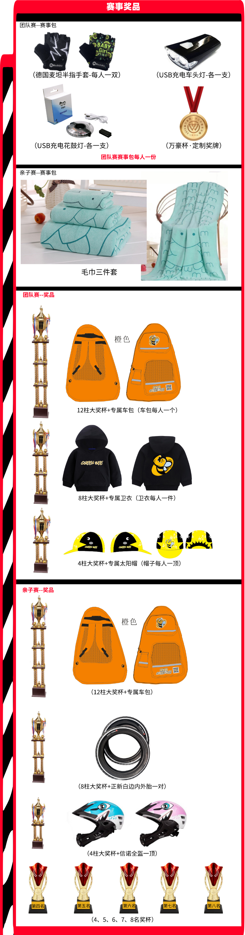 5、团队赛以每支队伍4位骑手全部完成比赛的总用时为依据,记录最终成绩。