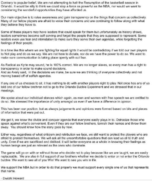 “我们并没有试图阻止NBA在奥兰多复赛。如果认为我们可以阻止NBA,这很愚蠢。”这是霍华德最新发表的声明,不管之前是人们和媒体误解了也好,还是霍华德的态度来了个大反转,总之再次谈到这个话题,霍华德有了不一样的说法。