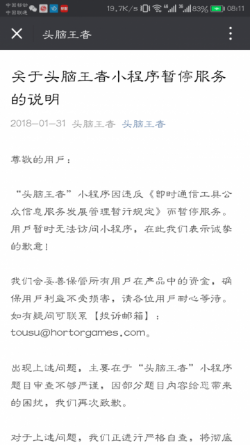 “头脑王者”小程序因违规暂停服务 恢复时间未知
