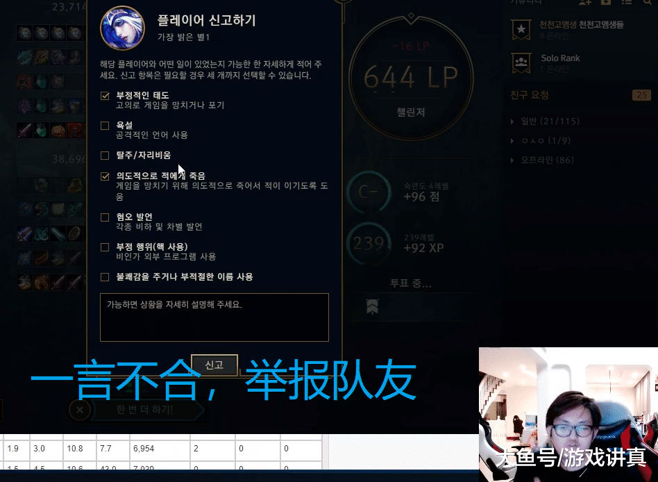 但为什么金贡开直播的时候,脾气那么爆炸呢?这在于他上一局游戏被人坑了!紧接着金贡就开始查四个队友的战绩以及历史纪录了,只要是觉得坑的都立马就点举报了,这心态简直像极了晋级赛失利的我们。