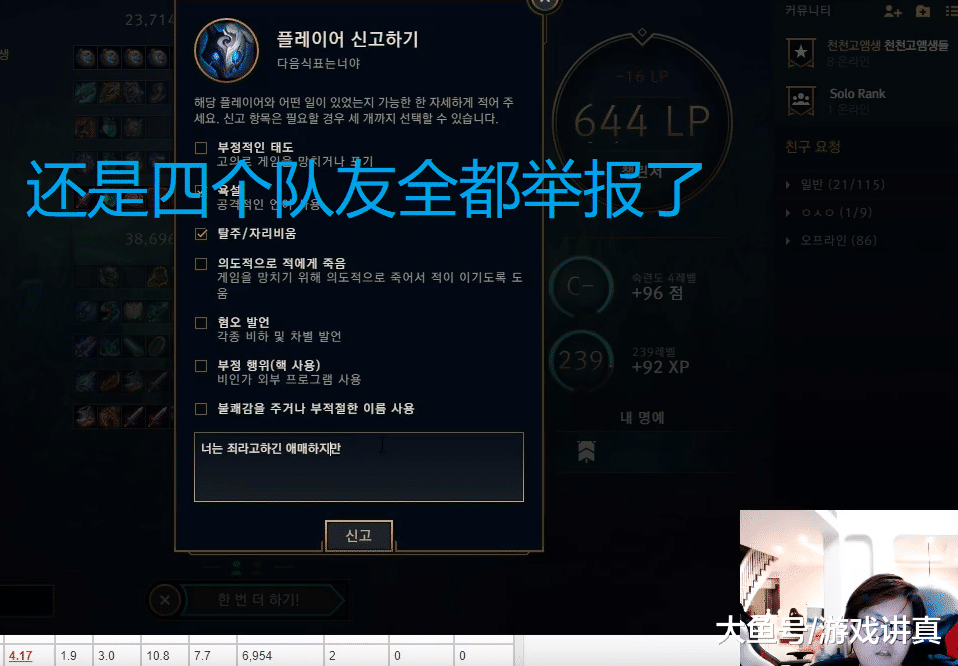 金贡在线举报了四个队友,然后快乐的进行了中韩英三语RAP。看到了金贡这样认真的举报队友后金贡,大家也应该很懂FPX全员认真打游戏的原因了吧,这谁要是打得菜了,那么金贡肯定会在赛后进行RAP,让队友好好反省的。如果不想要被金贡喷,那就只能努力的打比赛咯。