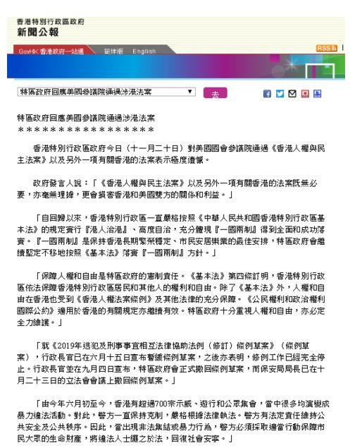 以下是香港特区政府新闻公报全文:特区政府回应美国参议院通过涉港法案香港特别行政区政府今日(十一月二十日)对美国国会参议院通过《香港人权与民主法案》以及另外一项有关香港的法案表示极度遗憾。政府发言人说:“《香港人权与民主法案》以及另外一项有关香港的法案既无必要,亦毫无理据,更会损害香港和美国双方的关系和利益。”“自回归以来,香港特别行政区一直严格按照《中华人民共和国香港特别行政区基本法》的规定实行‘港人治港’、高度自治,充分体现‘一国两制’得到全面和成功落实。‘一国两制’是保持香港长期繁荣稳定、市民安居乐业的最佳安排,特区政府会继续坚定不移地按照《基本法》落实‘一国两制’方针。”“保障人权和自由是特区政府的宪制责任。《基本法》第四条订明,香港特别行政区依法保障香港特别行政区居民和其他人的权利和自由。除了《基本法》外,人权和自由在香港也受到《香港人权法案条例》及其他法律的充分保障。《公民权利和政治权利国际公约》适用于香港的有关规定亦继续有效。特区政府十分重视人权和自由,亦必定全力维护。”“就《2019年逃犯及刑事事宜相互法律协助法例(修订)条例草案》(条例草案),行政长官已在六月十五日宣布暂缓条例草案,之后亦表明,修例工作已经完全停止。
