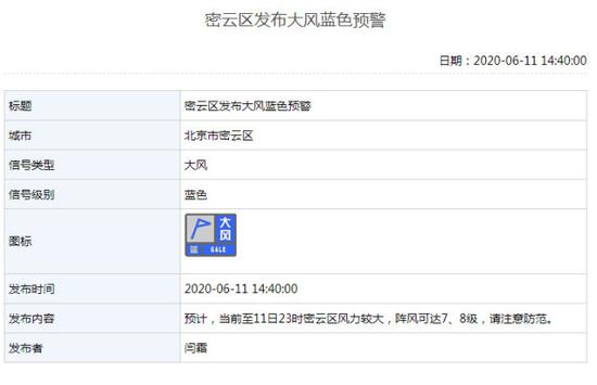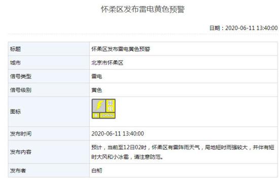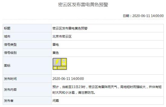 预计,当前至11日23时,密云区有雷阵雨天气,局地短时雨强较大,并伴有短时大风和小冰雹北京天气预警,请注意防范。