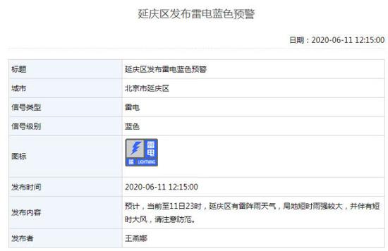预计,当前至11日23时,延庆区有雷阵雨天气,局地短时雨强较大,并伴有短时大风,请注意防范。
