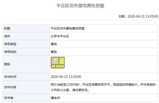 预计当前至12日05时,平谷区有雷阵雨天气,局地短时雨强较大,并伴有短时大风和小冰雹,请注意防范。
