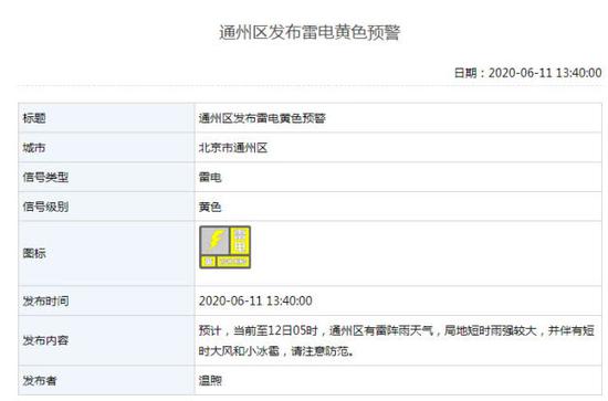 预计,当前至12日05时,通州区有雷阵雨天气,局地短时雨强较大,并伴有短时大风和小冰雹,请注意防范。