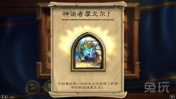 招募第一个好友到20级以后,你就可以获得新的鱼人英雄摩戈尔的皮肤了,之后再招募好友的话,会送你一个卡包。(卡包可要可不要,也不差这一包两包,如果是要自己练号的话去打打天梯转100金币也比练个小号有意思的多。)