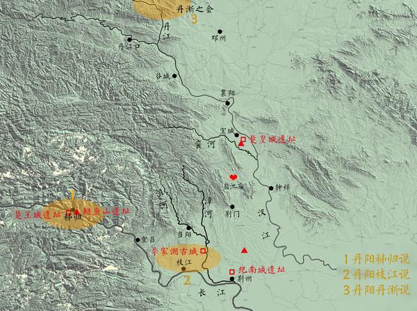 枝江说同样有文献与考古的支持。文献上,见上文引文;考古上,枝江所在的沮漳河中游发现了当阳季家河古城(见上图)。因此,在发现当阳季家河古城后,支持枝江说的文章明显增多。可是,后来季家河古城被判定为春秋时期城址,因此沮漳河中游被认为不可能是商末西周时期的丹阳所在地。