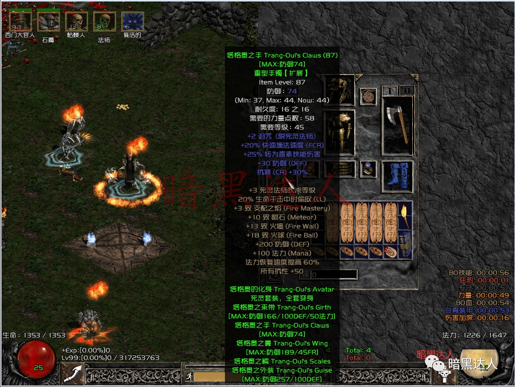 当死灵法师装备全套的“塔格奥套装”时,并不像其他大部分职业有发光特效,而是会变身成类似于游戏中的吸血鬼模型。注:暗黑达人原创文章死灵法师套装,图片水印与作者不符请举报。套装能额外提高角色职业技能等级并且带来大量抗性提升,而有趣的地方在于还会赋予角色一些法师火系技能,例如“火焰支配”、“陨石”、“火墙”等等,但这些技能由于加成问题整体伤害能力较弱并不适合当作主输出技能。