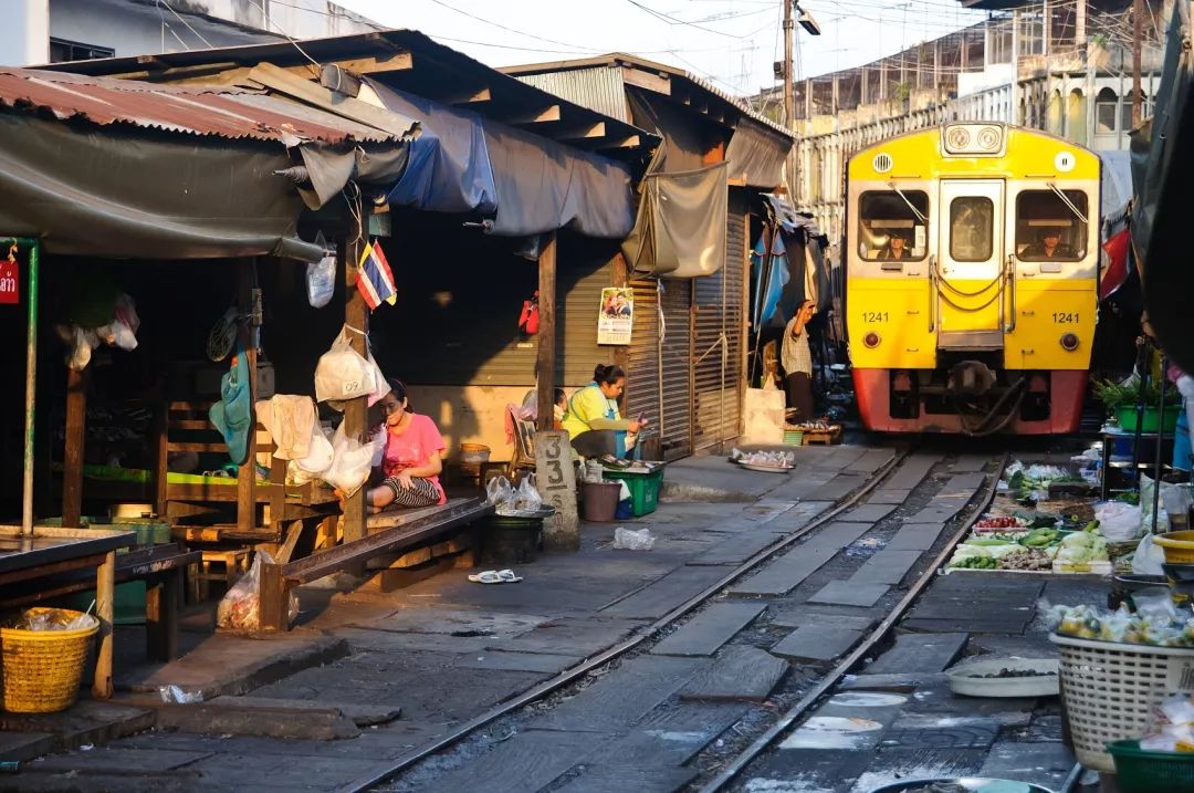 美功火车集市是世界上唯一一个跟火车0距离接触的集市,已经在曼谷的美功小镇存在了十几年,本来只是个为当地居民提供生鲜蔬果的小菜场,却因为从美功火车站开往曼谷方向的火车每天会经过这个宽不及3米的市场,场面非常惊险而闻名全球。