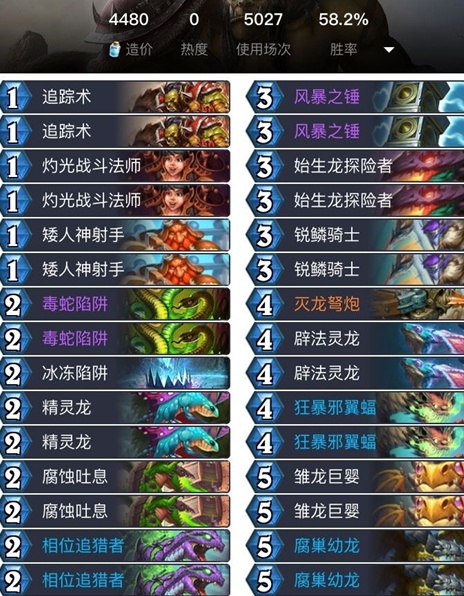 其实猎人职业最初非常流行T7猎,但由于T7猎在控场能力上较弱,若是在前期稍微卡手断掉节奏,那么很容易就会被对手用场面压死。这套龙猎加入了巨龙版本的几张新卡,不仅进攻能力极强,而且还能稳定的进行控场,并且卡组也不贵,非常适合尘不多的新玩家使用。这套龙猎在当前标准天梯中属于毒瘤卡组,强度极高。