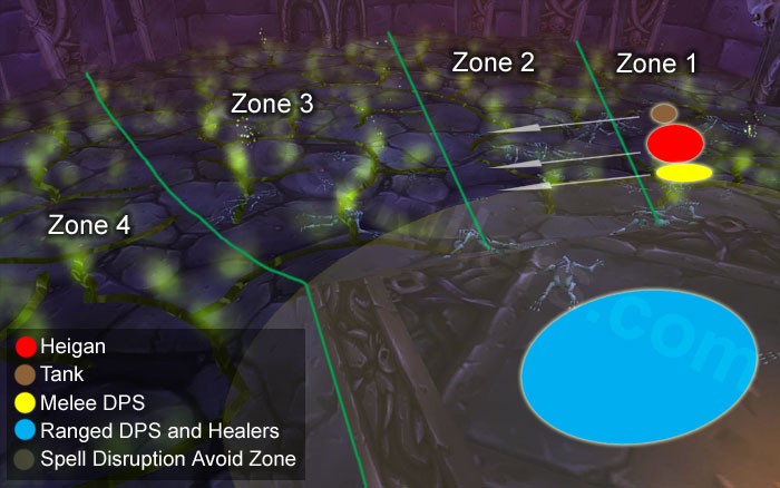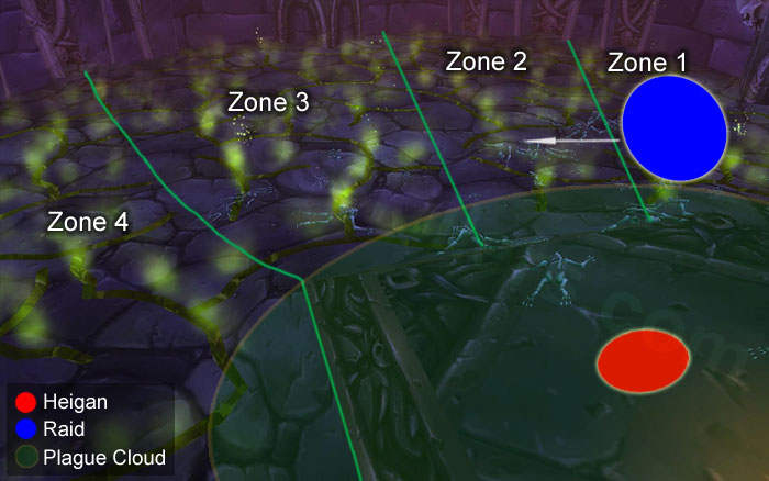 每当希尔盖施展衰竭热病的时候,能驱散疾病的职业一定要立刻驱散之。战斗开始后10秒,希尔盖会使用第一次瘟疫爆发。爆发结束后,坦克和近战成员立刻跑到2区(如上图所示)以准备对付下一次喷发。