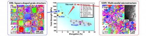 针对SLM成形RAFM钢高强度与低塑性不匹配问题,深圳大学增材制造研究所劳长石和陈张伟研究团队围绕CLF-1钢的SLM工艺及其组织性能调控开展了系统工作,首次将非均质双/多模组织设计思路引入到SLM成形高强韧RAFM钢的开发,基于SLM工艺参数和扫描策略的优化,SLM成形CLF-1钢兼具高强度(屈服强度1053 MPa)与高塑性(延伸率16.9%),其综合强韧性显著优于目前文献报道的RAFM钢。通过对比研究S209和S98的微观组织和力学性能,揭示了SLM成形CLF-1钢的强韧化机理活化钢,其高强度取决于细晶和细小马氏体片层,高塑性得益于这种双/多模组织对位错主导的加工硬化能力的改善。该工作为3D打印高强韧RAFM钢的结构设计提供重要理论依据和技术指导,促进聚变堆关键部件组织性能可控的一体化成型。相关研究成果发表于国际知名学术期刊Materials Research Letters (IF:7.440)。